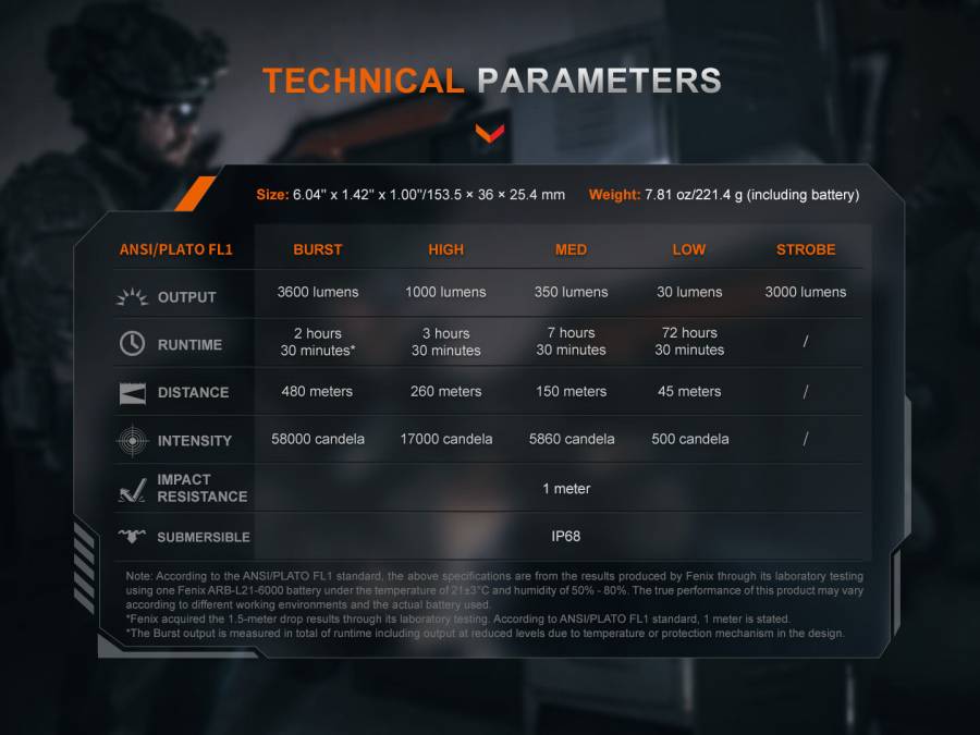 Με μέγιστη απόδοση 3600 lumen και απόσταση δέσμης 480 μέτρων, προσφέρει ισχυρή απόδοση για τις υπηρεσίες επιβολής του νόμου, τους επαγγελματίες ασφαλείας και τα μέλη της πολιτικής προστασίας.