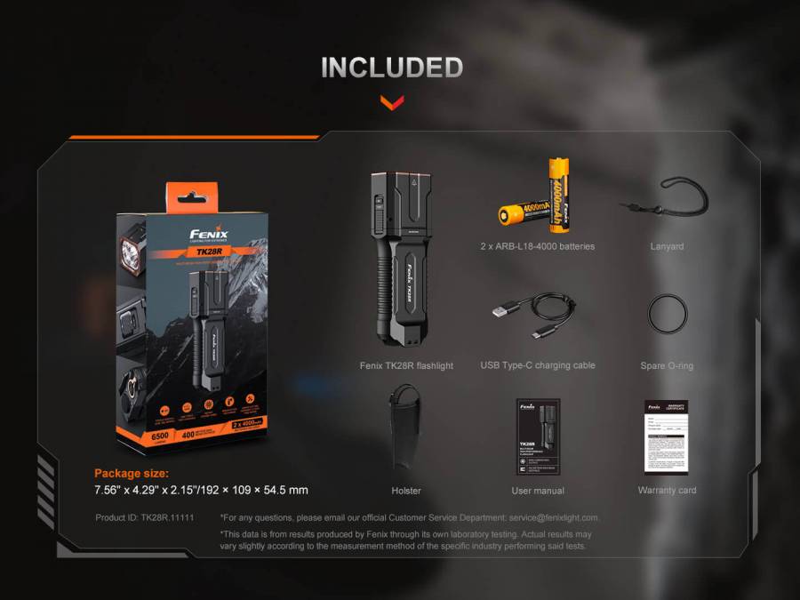 Ο Φακός Fenix TK28R τροφοδοτείται με δύο επαναφορτιζόμενες μπαταρίες 4000mAh, ο TK28R λειτουργεί έως και 102 ώρες και επαναφορτίζεται σε λιγότερο από 1,5 ώρα μέσω της θύρας γρήγορης φόρτισης USB-C, η οποία προστατεύεται από ένα συρόμενο κάλυμμα.