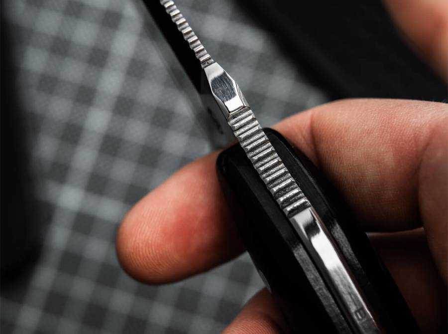 Οι μαύρες κλίμακες λαβής Micarta, οι οποίες είναι κομψά διακοσμημένες, εξασφαλίζουν τέλεια θέση χεριού.
