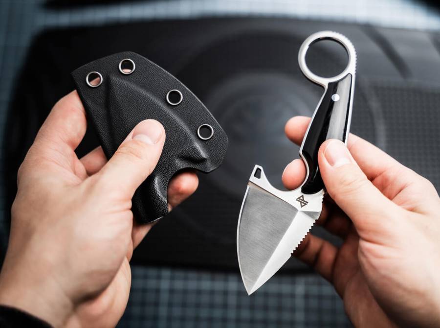 Παρέχεται με μια τέλεια εφαρμοστή θήκη Kydex για χρήση ως πλήρες μαχαίρι λαιμού ή μαχαίρι tactical.