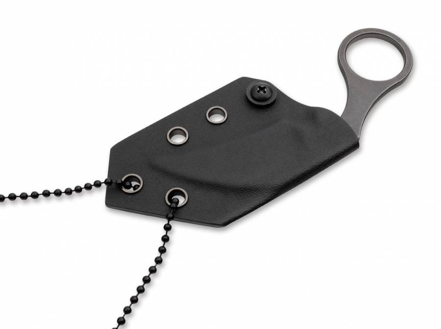 Παρέχεται με μια ειδικά κατασκευασμένη θήκη Kydex και μια αλυσίδα με μπίλια για χρήση ως μαχαίρι λαιμού.
