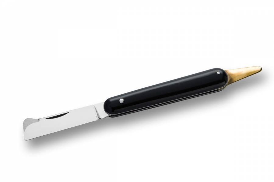 Grafting knife with black plastic handle with fixed bark-lifter, carbon steel blade