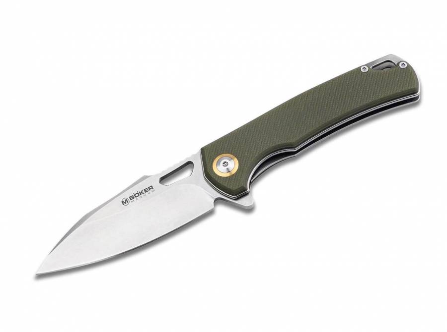 Οι ανάγλυφες λαβές από πράσινο G10 μοιάζουν με δέρμα ερπετού και εξασφαλίζουν άνετο κράτημα.