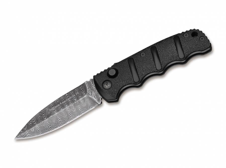 Η λεπίδα με την αιχμή του δόρατος αυτού του αυτόματου μαχαιριού συναρπάζει με την λεπτή μαρμάρινη Δαμασκό (192 στρώσεις, σφυρήλατες) και το μετατρέπει σε ένα αποκλειστικό αλλά και οικονομικό συλλεκτικό αντικείμενο.