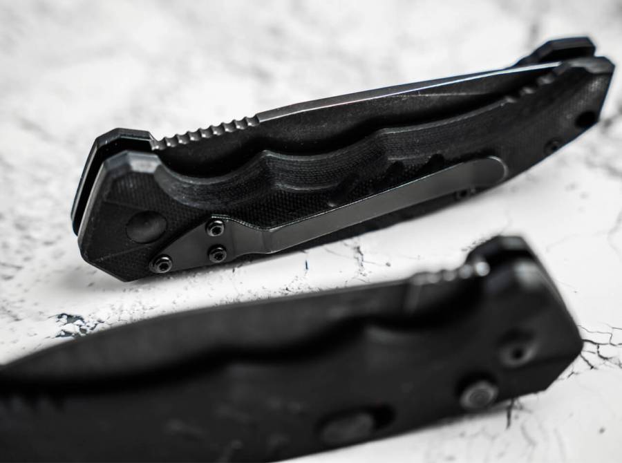 Πατώντας το κουμπί απελευθερώνεται η σκούρα λεπίδα από πετροβάμβακα D2, με την τάση του ελατηρίου πίσω από αυτήν, και στη συνέχεια ανοίγει αυτόματα. Ένα καθαρό κλείδωμα ασφάλισης ασφαλίζει περαιτέρω το μαχαίρι από τυχαία απελευθέρωση.