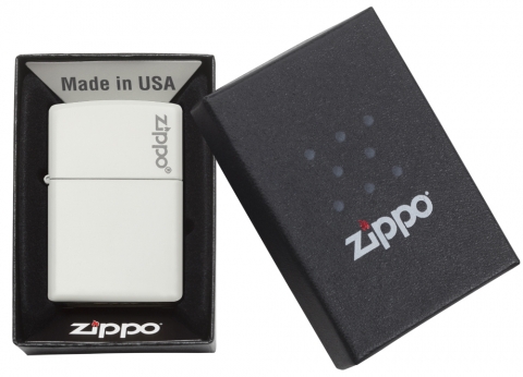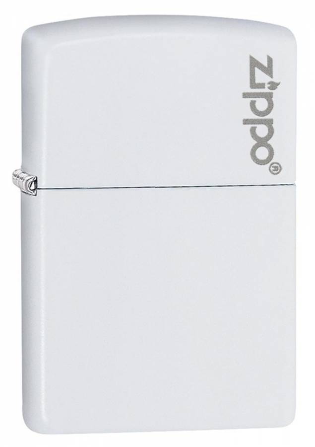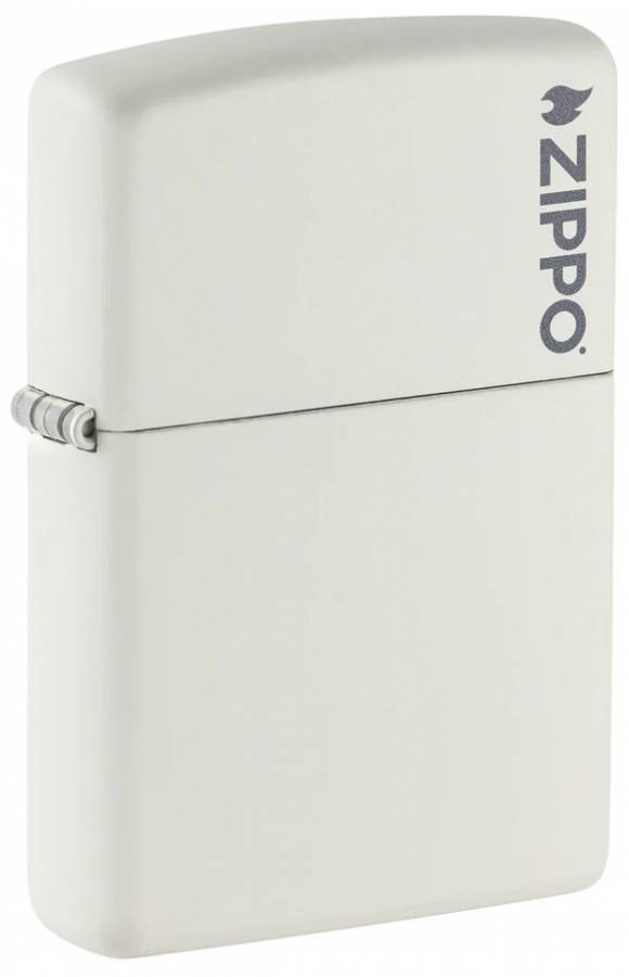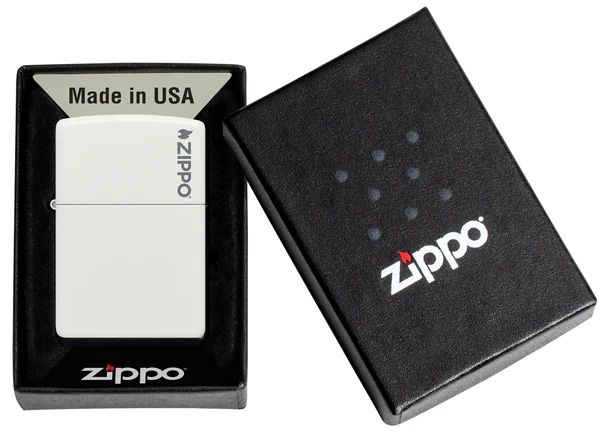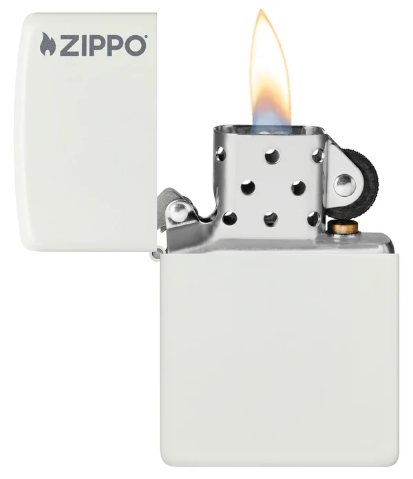 Αυτός ο λευκός ματ αντιανεμικός αναπτήρας είναι διακοσμημένος με το κλασικό λογότυπο Zippo.