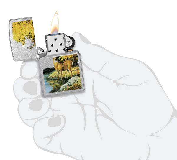 Απεικονίζοντας ένα μεγαλοπρεπές ελάφι δίπλα σε ένα ηλιόλουστο ρυάκι, το εκπληκτικό της έργο, Season of Beauty, αναπαράγεται σε αυτόν τον αναπτήρα Street Chrome σε σχέδιο Color Image.