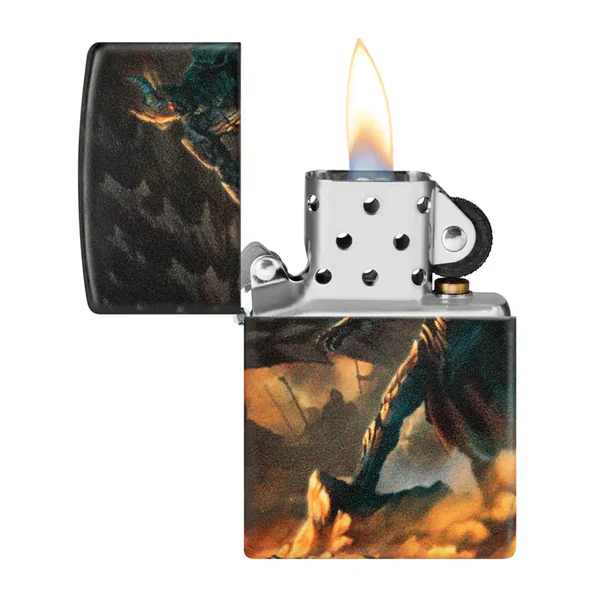 Ένας τολμηρός ιππότης επιθεωρεί ένα άγονο τοπίο, ενώ ένας άγριος δράκος εκτοξεύει μια έκρηξη φωτιάς, με το σχέδιο να καλύπτει όλες τις πλευρές του αναπτήρα.
