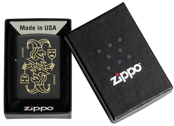 Ένα περίπλοκο σχέδιο κάρτας Joker λάμπει σε ορειχάλκινους τόνους στην επιφάνεια αυτού του κλασικού μαύρου ματ αναπτήρα με ένα ιδιόμορφο σχέδιο χάραξης με λέιζερ.