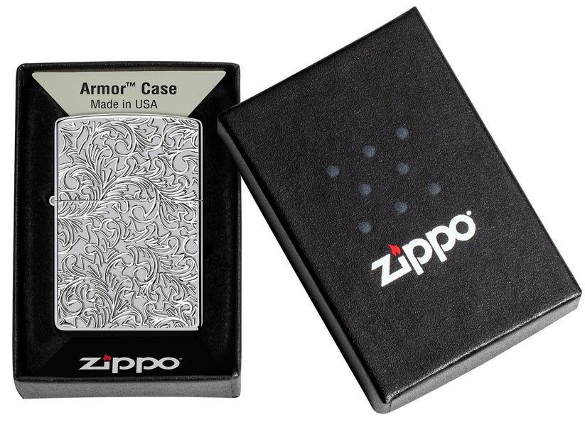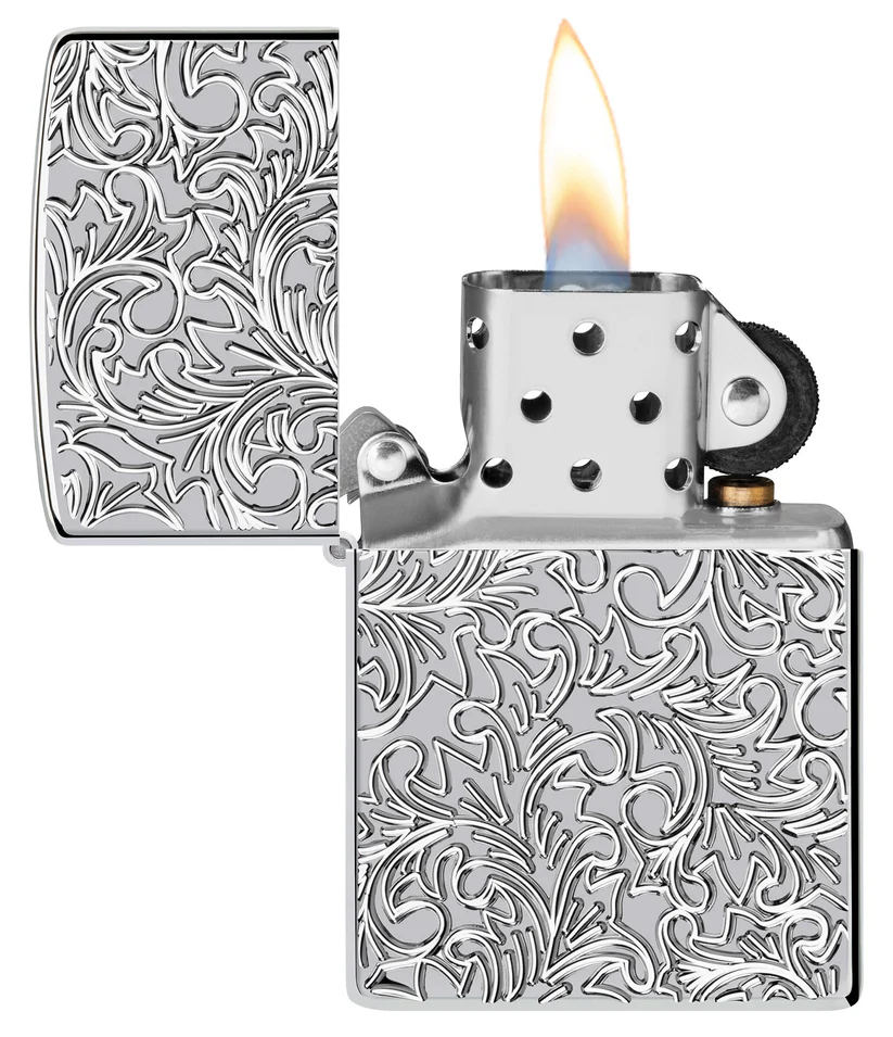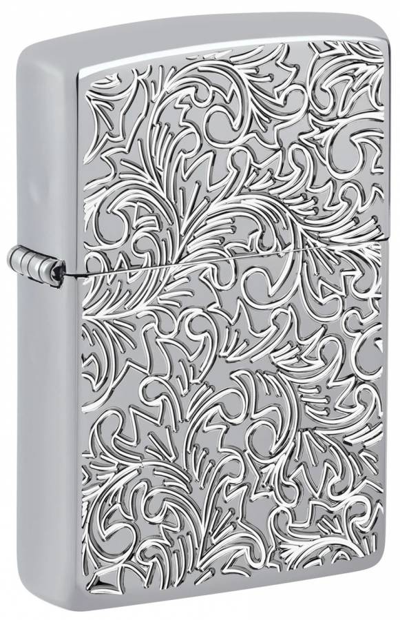 Περίπλοκο συρματόπλεγμα απλώνεται στην επιφάνεια αυτού του αναπτήρα Armor® High Polish Chrome σε ένα πολυτελές σχέδιο Deep Carve.