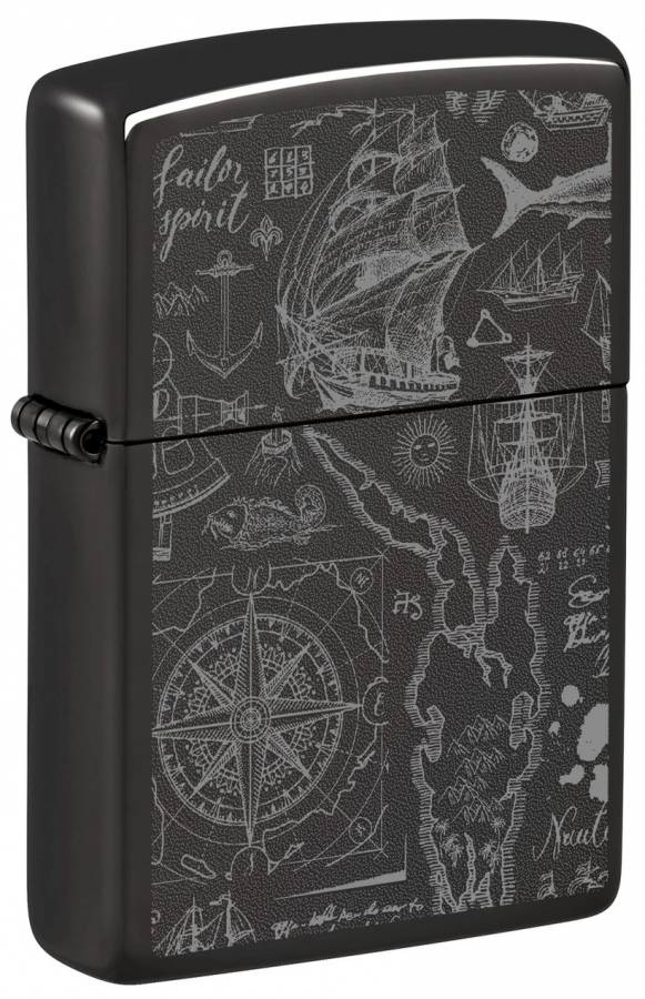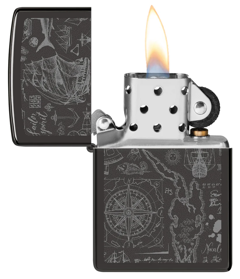Ταξιδέψτε στις Επτά Θάλασσες με αυτόν τον κλασικό μαύρο αναπτήρα High Polish. Πλοία, πυξίδες, χάρτες και άλλα ναυτικά στοιχεία γεμίζουν την επιφάνεια του κομματιού σε ένα διακριτικό σχέδιο Photo Image.