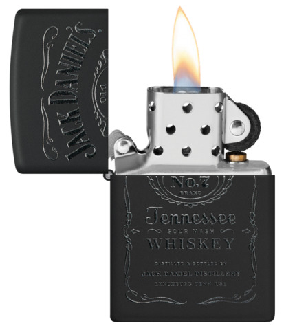 Ο κομψός μαύρος ματ αναπτήρας διαθέτει το εμβληματικό λογότυπο Jack Daniel’s® που αναπαράγεται σε μαύρο σχέδιο έγχρωμης εικόνας για ένα κομψό εφέ τόνου.