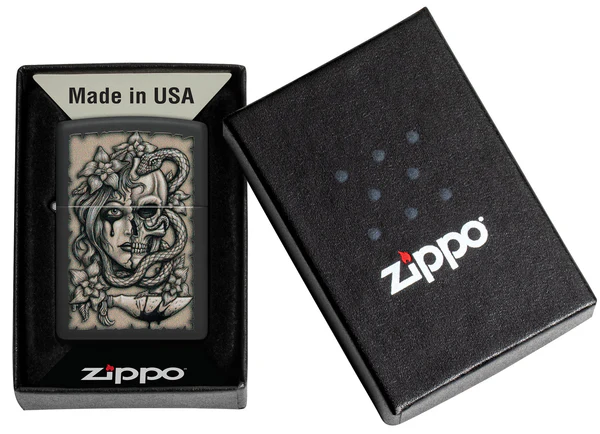Η ζωή και ο θάνατος αντιπαραβάλλονται όμορφα με αιματηρή λεπτομέρεια σε αυτόν τον κλασικό μαύρο ματ αναπτήρα σε ένα στοιχειωτικό σχέδιο Color Image.