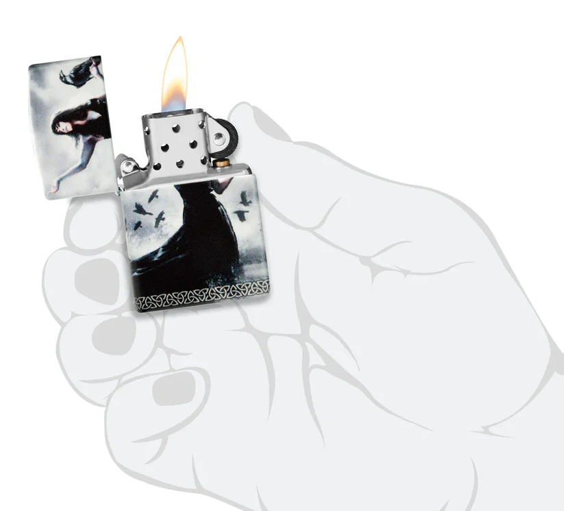 Η μυστικιστική σκηνή παρουσιάζει μια στωική φιγούρα που διοικεί ένα κοπάδι κοράκια και εκτείνεται απρόσκοπτα σε όλες τις πλευρές του αναπτήρα.