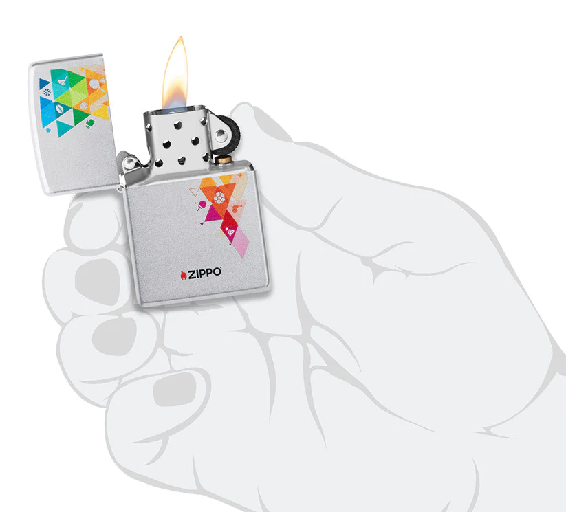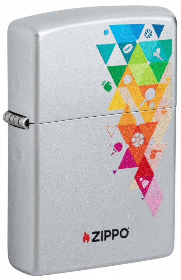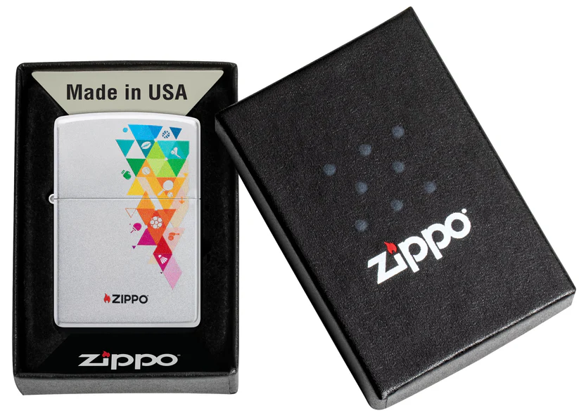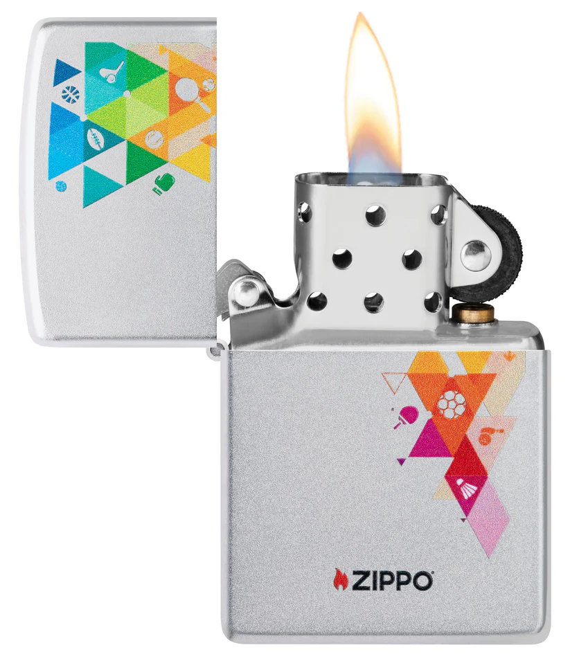 Αναπτήρας Zippo με μοτίβο Rainbow, βάση από σατινέ χρώμιο, διακοσμημένος με ένα πολύχρωμο γραφικό εμπνευσμένο από τους Θερινούς Ολυμπιακούς Αγώνες του 2024 στο Παρίσι.