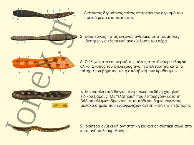 Πιο συγκεκριμένα, η σόλα ACTIVE αποτελείται από 5 διαφορετικά επίπεδα, έχει μικρά ελαστικά ελατήρια που κάνουν μασάζ στο πόδι, επιπλέον αφρώδες υλικό με μικρό αερόφουσκες για πλήρη απορρόφηση των κραδασμών, πάνω από αυτά υπάρχουν διάτρητοι πάτοι ενεργού άνθρακα για ανακύκλωση του αέρα ώστε να μην ιδρώνει και να μη μυρίζει το πόδι και τέλος το κάτω μέρος με double density PU, αντιστατικό, και με τεχνολογία total grip, κάνει τη σόλα αντιολισθητική αλλά και ανθεκτική σε όλα τα εδάφη.